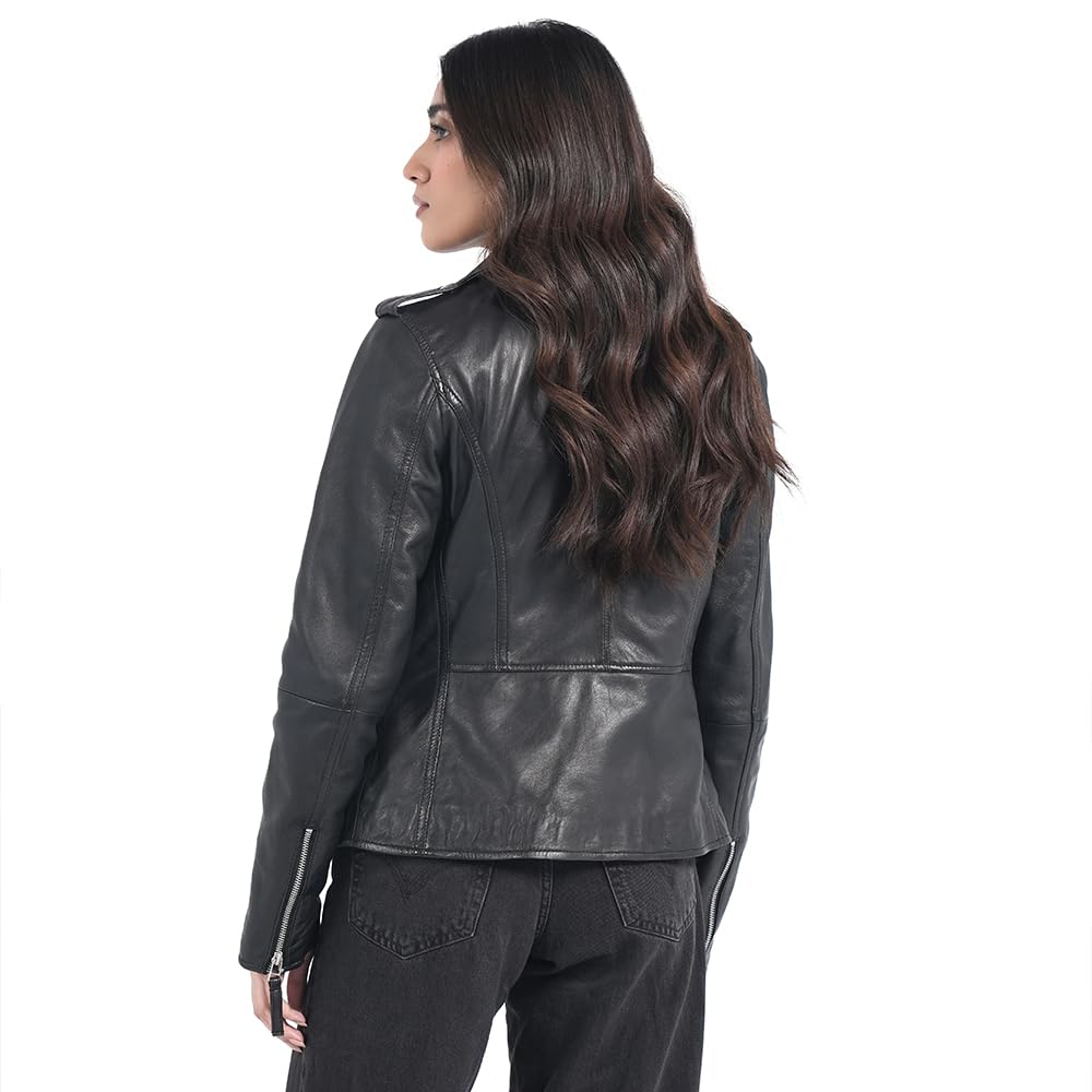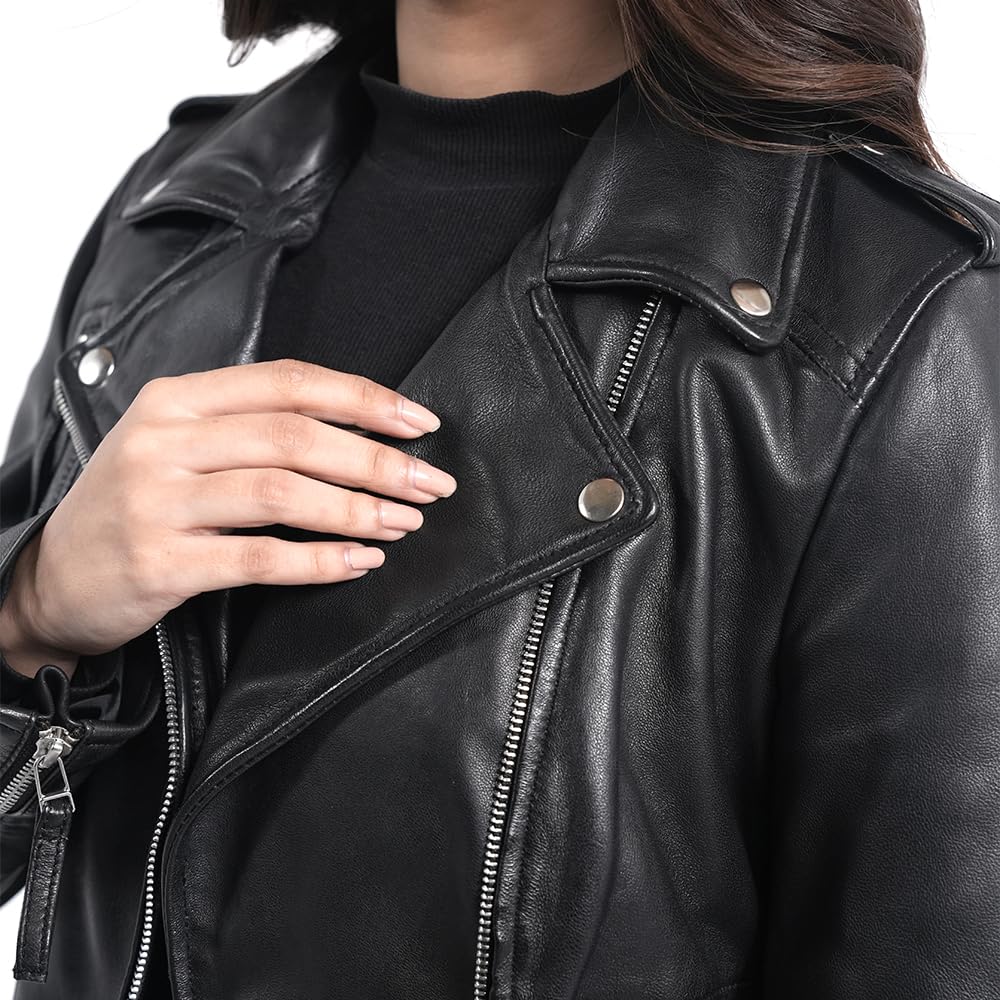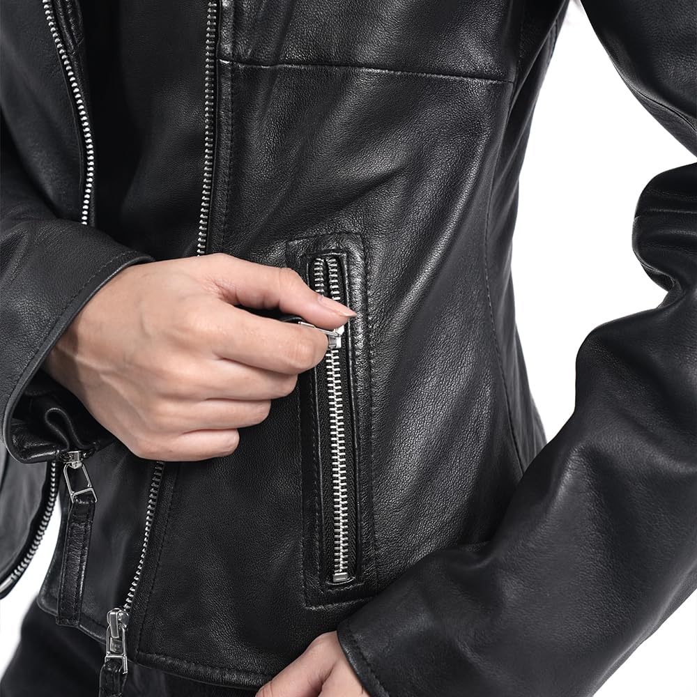 - Premium Materials: This women’s leather jacket is crafted from 100% lambskin leather with a soft polyester lining, ensuring lasting quality and comfort. Designed in a biker style with a classic lapel collar, it features a functional chest lapel, front zipper, three pockets, and cuff zippers—all with leather pullers for a refined touch.